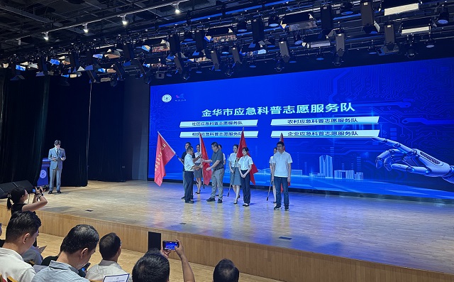 金華市科協(xié)黨組書記、主席施怡偉為社區(qū)應(yīng)急科普志愿服務(wù)隊(duì)、農(nóng)村應(yīng)急科普志愿服務(wù)隊(duì)、校園應(yīng)急科普志愿服務(wù)隊(duì)、企業(yè)應(yīng)急科普志愿服務(wù)隊(duì)等4支應(yīng)急科普志愿服務(wù)隊(duì)授旗。