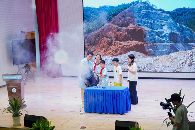 浙江省科普聯(lián)合會靠譜傳播團隊成員仰晗、陳林孝帶來的科學實驗秀《兩山有理:地球健康實驗室》,通過妙趣橫生的互動實驗,成功點燃在場學生對科學探索的好奇與熱情。