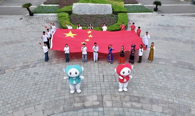 南操場上,12米長的巨幅國旗是最莊重的“青春告白”。數(shù)十名學生牽手,小心翼翼地牽引著鮮紅的旗幟緩緩展開,陽光灑在國旗上,也映在每個人肅穆的臉龐!爸讣庥|到國旗的那一刻,突然懂了‘守護’的重量!眳⑴c舉旗的同學皮慧方說。不遠處,國旗護衛(wèi)隊成員身著軍裝,邁著鏗鏘步伐開展升國旗、踢正步訓練,挺拔的身姿盡顯擔當。學生代表身著“青春為中國式現(xiàn)代化挺膺擔當”的T恤,字字鏗鏘喊出報國志,各民族學子穿特色服飾舉小國旗齊唱祝!,F(xiàn)場師生紛紛感慨:“不同的模樣,同樣的愛國心!”