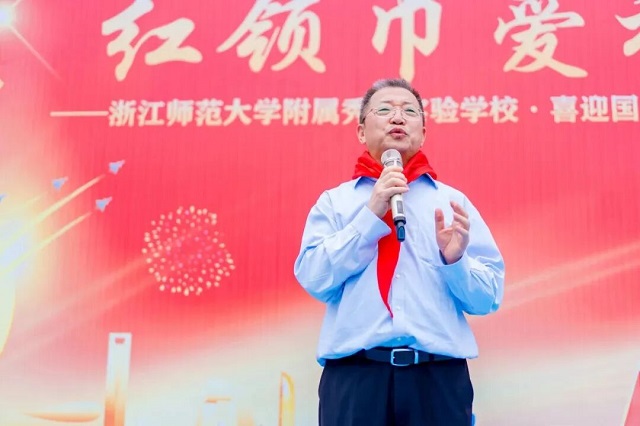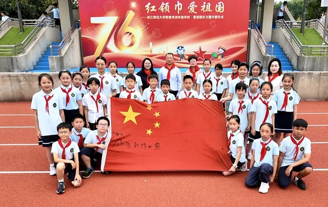 9月29日,浙江東方博物館館長董利華,攜珍貴的曾聯(lián)松簽名五星紅旗,走進(jìn)浙江師范大學(xué)附屬秀洲實(shí)驗(yàn)學(xué)校,出席“致敬五星紅旗,紅領(lǐng)巾愛祖國”喜迎國慶主題升旗儀式,并以國旗下講話為全體師生上了一堂生動的愛國教育課。