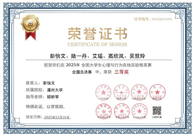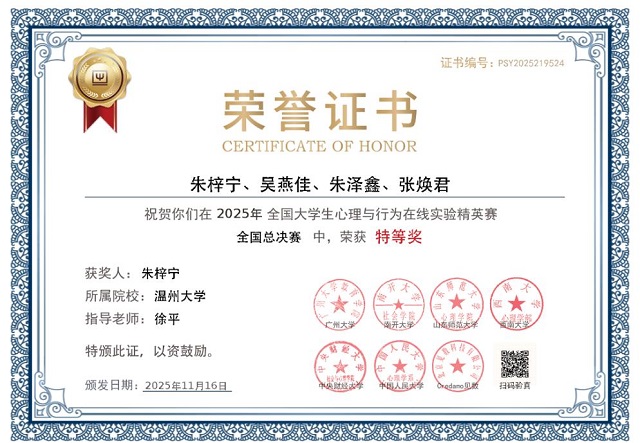 日前,第三屆全國大學(xué)生心理與行為在線實驗精英賽總決賽在中央財經(jīng)大學(xué)落幕。溫州大學(xué)學(xué)子憑借扎實的專業(yè)功底與創(chuàng)新的實驗設(shè)計,從6694名參賽者中脫穎而出,斬獲研究生全國特等獎、本科生全國三等獎的優(yōu)異成績。徐平老師、顧昕宇老師獲評優(yōu)秀指導(dǎo)老師,徐平老師獲十佳指導(dǎo)老師,學(xué)校亦榮膺最佳組織獎,實現(xiàn)師生與集體榮譽的多重突破。