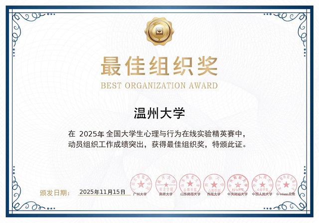 憑借完善的備賽體系與突出的參賽成績,溫州大學(xué)獲評優(yōu)秀組織獎,這一榮譽既是對學(xué)校教師教育學(xué)院"以賽促教、教賽相長"培養(yǎng)模式的肯定,也彰顯了其在心理學(xué)實驗教學(xué)領(lǐng)域的影響力。